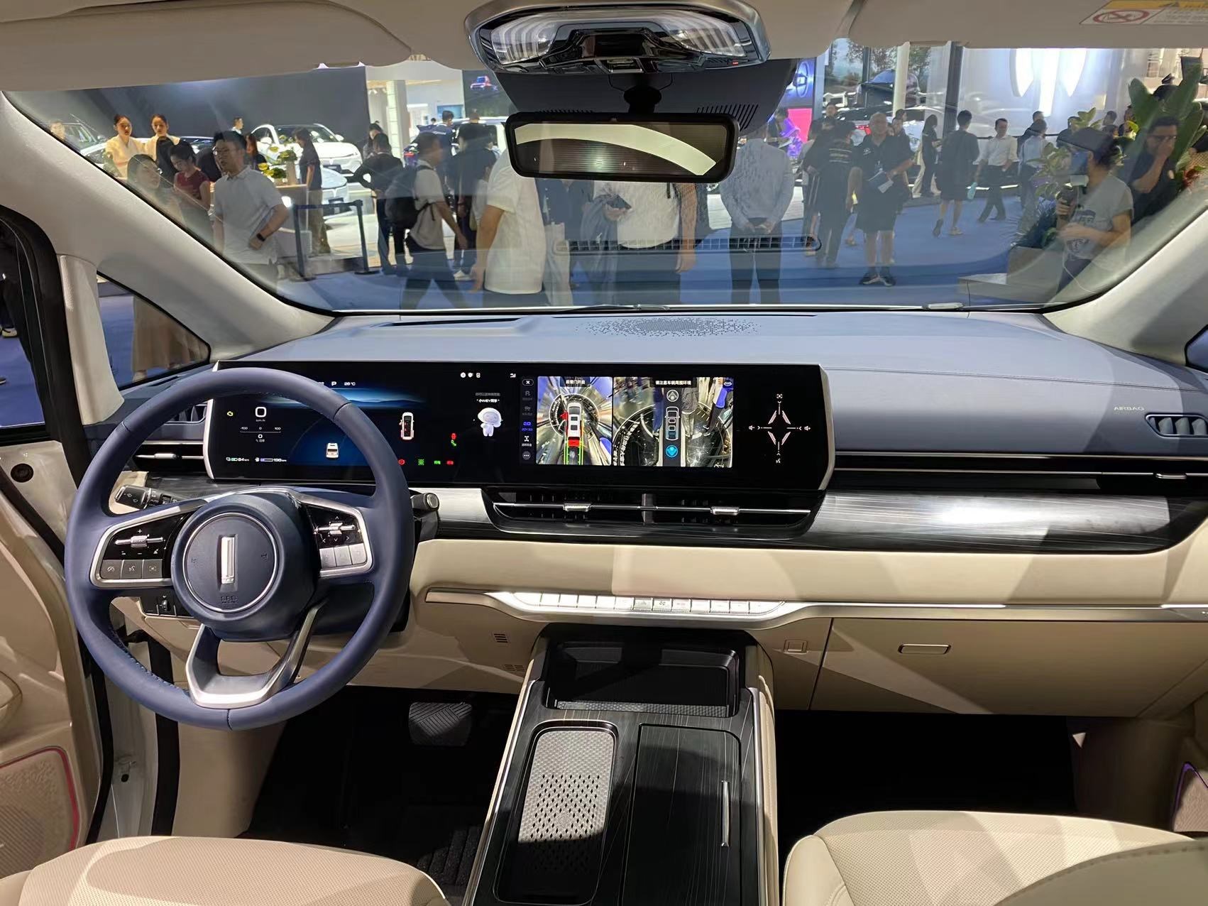 進入車內(nèi),最引人矚目的便是由三塊12.3英寸屏組成的聯(lián)屏系統(tǒng),并內(nèi)置高通驍龍8155芯片斑馬智行系統(tǒng)。主副駕車門上還配備了電子后視鏡(選裝件)的車內(nèi)顯示屏,座艙的科技感濃重。整個內(nèi)飾風(fēng)格素雅簡約,中控臺和中央通道區(qū)域使用了大面積皮質(zhì)包覆,質(zhì)感豪華。
