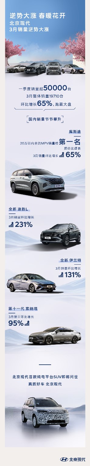車市經(jīng)過(guò)2024年瘋狂的內(nèi)卷,進(jìn)入2025年后,造車底蘊(yùn)的重要性日益凸顯,品質(zhì)被越來(lái)越多的消費(fèi)者所看重,這為一貫有著良好品質(zhì)口碑的北京現(xiàn)代銷量增長(zhǎng)提供了良機(jī)。數(shù)據(jù)顯示,北京現(xiàn)代一季度銷量超過(guò)50000臺(tái),跑贏大盤(pán),而且加速增長(zhǎng)的勢(shì)頭明顯,僅3月銷量就達(dá)到19710臺(tái),環(huán)比增長(zhǎng)65%。