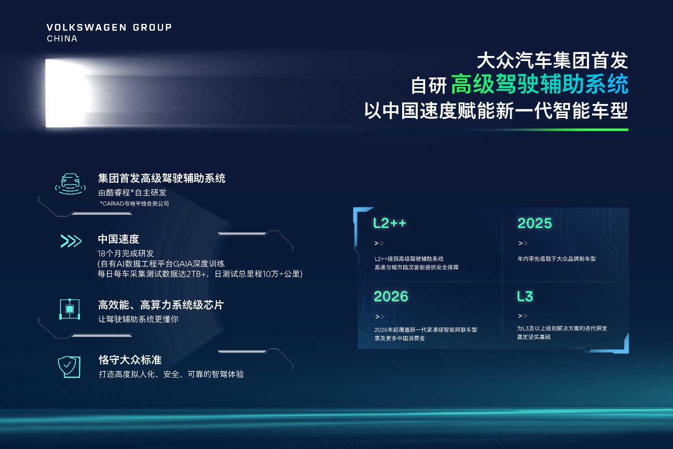 作為活動的另一大重磅科技亮點(diǎn),大眾汽車集團(tuán)專為中國復(fù)雜多樣的路況量身打造的高級駕駛輔助系統(tǒng)正式發(fā)布。該系統(tǒng)由集團(tuán)旗下軟件公司CARIAD與地平線的合資公司酷睿程(CARIZON)研發(fā),由AI賦能、具有自主學(xué)習(xí)能力,能夠為駕駛者提供高度擬人化、多場景覆蓋、并以安全為先的駕駛輔助體驗。這一自主研發(fā)的系統(tǒng),彰顯了大眾汽車集團(tuán)在競爭激烈的中國市場上的技術(shù)實(shí)力,以及在中國高級駕駛輔助領(lǐng)域的領(lǐng)先地位。該系統(tǒng)將在今年率先搭載于一款面向中國市場的大眾品牌新車型,并計劃于明年起進(jìn)一步應(yīng)用到基于CMP平臺(Compact Main Platform)開發(fā)的全新智能網(wǎng)聯(lián)車型,滿足更多主流緊湊型細(xì)分市場消費(fèi)者的需求。這一系統(tǒng)最高可實(shí)現(xiàn)L2++級別駕駛輔助功能,提供安全流暢的駕駛體驗,并為L3及以上級別解決方案的迭代研發(fā)奠定堅實(shí)基礎(chǔ)。