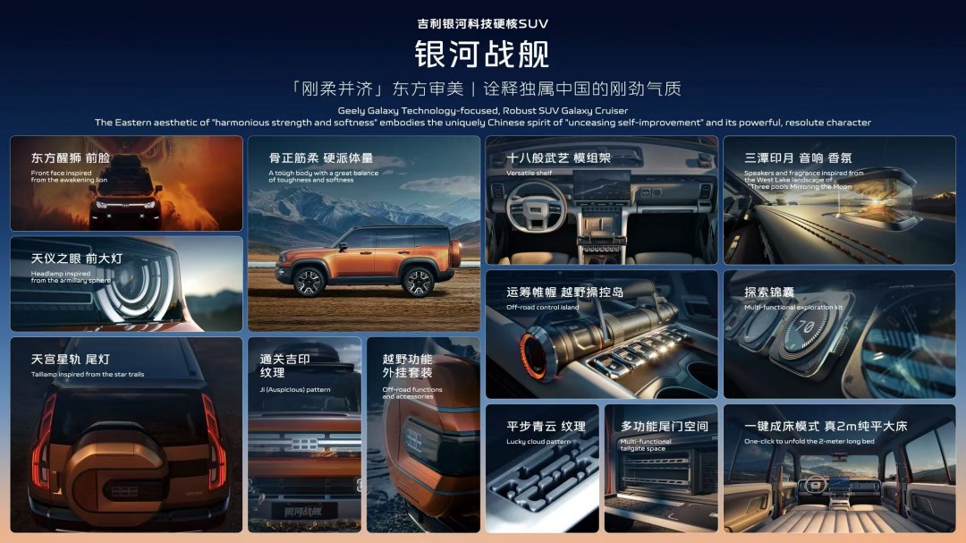 發(fā)布會(huì)上,吉利智能安全科技的集大成者——銀河戰(zhàn)艦迎來(lái)全球首發(fā)。銀河戰(zhàn)艦在設(shè)計(jì)上不僅展現(xiàn)了“剛?cè)岵?jì)”的東方審美,更詮釋了獨(dú)屬于中國(guó)人“自強(qiáng)不息”的剛勁氣質(zhì)。形似“渾天儀”的前大燈、勾勒“天宮星軌”的尾燈,靈感來(lái)自“游艇操縱桿”的越野操控島等設(shè)計(jì)等,均展現(xiàn)了吉利銀河“漣漪美學(xué)”在智電時(shí)代的硬派表達(dá)。