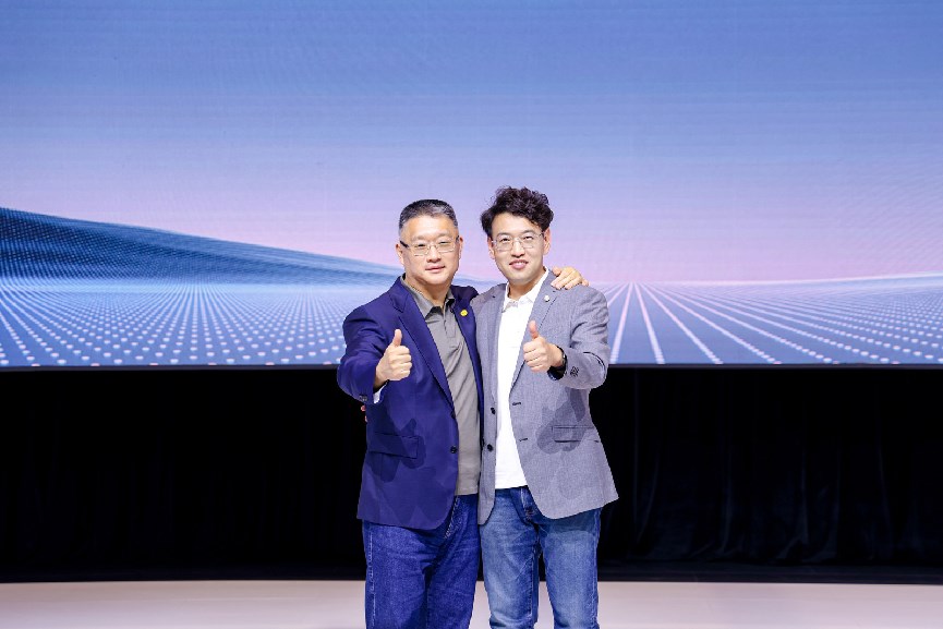 上汽集團總裁賈健旭(左)與火山引擎汽車總經(jīng)理楊立偉(右)合影