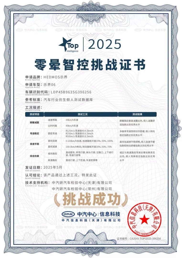 近期,在行業(yè)首次的暈動仿生假人零暈智控挑戰(zhàn)中,示界06展現(xiàn)了優(yōu)異的駕控表現(xiàn)。中國汽車研究中心有限公司高級工程師趙博文在發(fā)布會現(xiàn)場公布測試數(shù)據(jù)時指出:“通過精準的電機扭矩動態(tài)分配、法系底盤調(diào)?;颍约按钶d的‘零暈智控’技術體系,示界06在六維駕控測試中表現(xiàn)出行業(yè)優(yōu)秀水平?!睖y試結果顯示,示界06完美實現(xiàn)了“6不”卓越體驗:簸路不顛、彎道不飄、加速不竄、減速不抖、駕乘不暈、長途不累,為行業(yè)樹立了駕乘舒適新標桿。